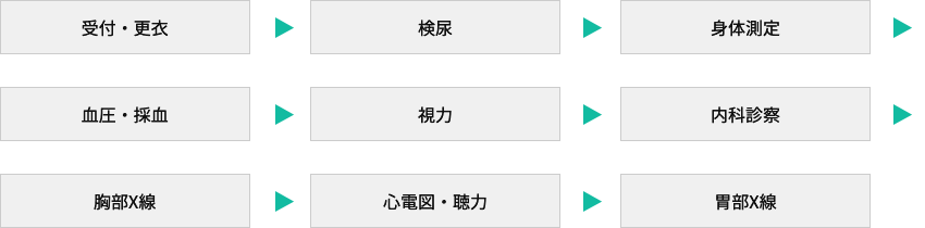 | ・内科診察 ・身体計測 ・腹囲 ・血圧 ・心電図 ・視力 ・聴力 ・胸部X線 ・胃部X線 | ||